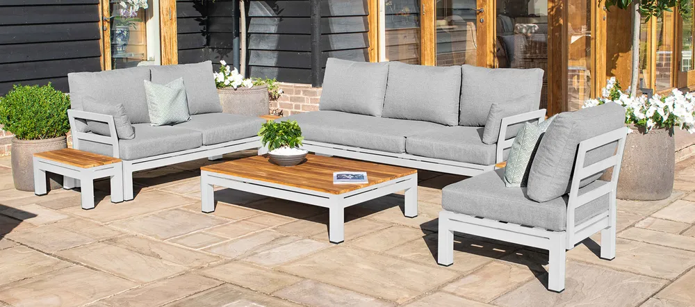 SET INCLUDES1x Reclining 3 Seat Sofa1x 2 Seat Sofa1x Corner Piece1x Teak Coffee Table - RectangularDoes not include Side Tables Length of Long Side - L292cmLength of Long Side - L222cm Reclining... Read More