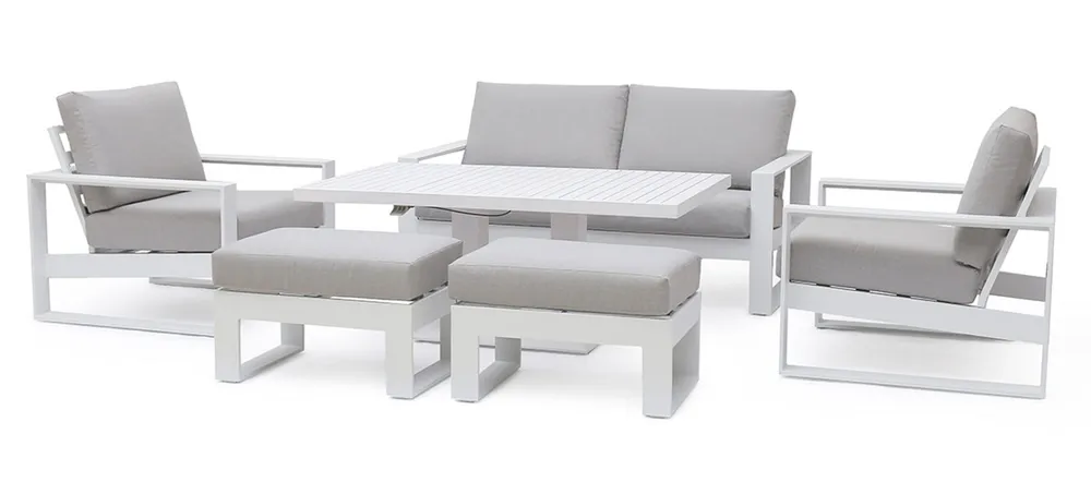 1x 2 Seat Sofa2x Armchairs2x Footstool1x Gas Lift Rising Table - Rectangular 2 Seat Sofa - H76cm x D91cm x W171cmArmchair - H76cm x D91cm x W94cm Footstool - H44cm x D50cm x W75cm Gas Lift Risin... Read More